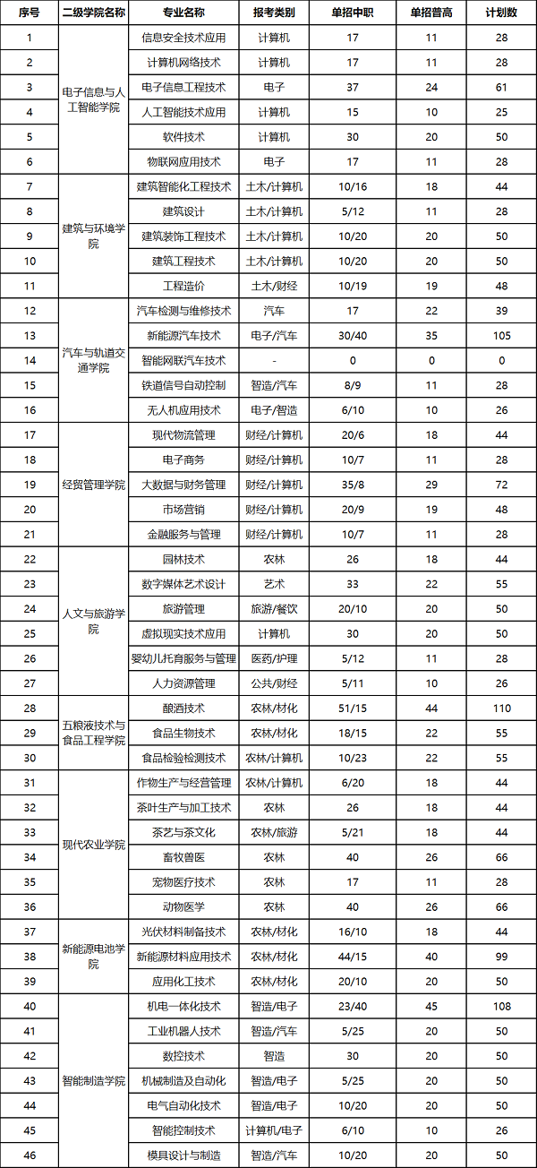 设有马克思主义学院、素质教育学院、电子信息与人工智能学院、智能制造学院、现代农业学院、经贸管理学院、五粮液技术与食品工程学院、新能源电池学院、汽车与轨道交通学院、建筑与环境学院、人文与旅游学院等11个二级学院,大专招生专业46个,职教本科专业2个,现有全日制在校生15000余人。