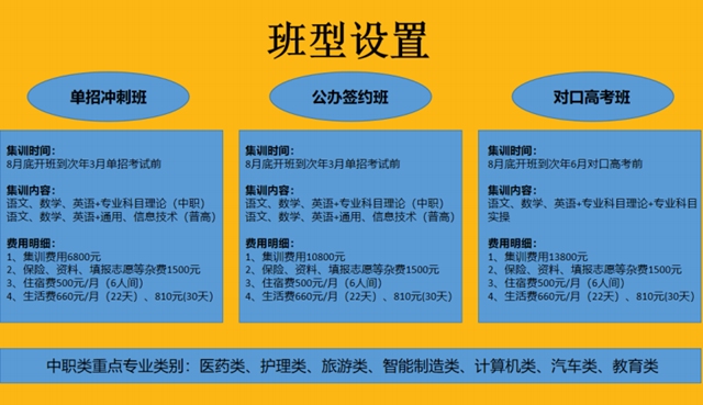 收费标准:冲刺班6800元、签约公办班10800元、对口高考班13800元。